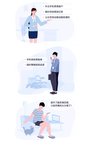 代賬公司員工不用再像以往一樣,需要時(shí)時(shí)電話溝通客戶回答賬務(wù)進(jìn)度、確認(rèn)各種事項(xiàng),忙到暈頭轉(zhuǎn)向客戶卻還是不滿意。有了小程序,不用登錄電腦,不用一堆a(bǔ)pp,客戶自主在微信上看報(bào)表、確認(rèn)稅金、確認(rèn)收票、查看服務(wù)進(jìn)度??蛻舾鼭M意、員工也更輕松!