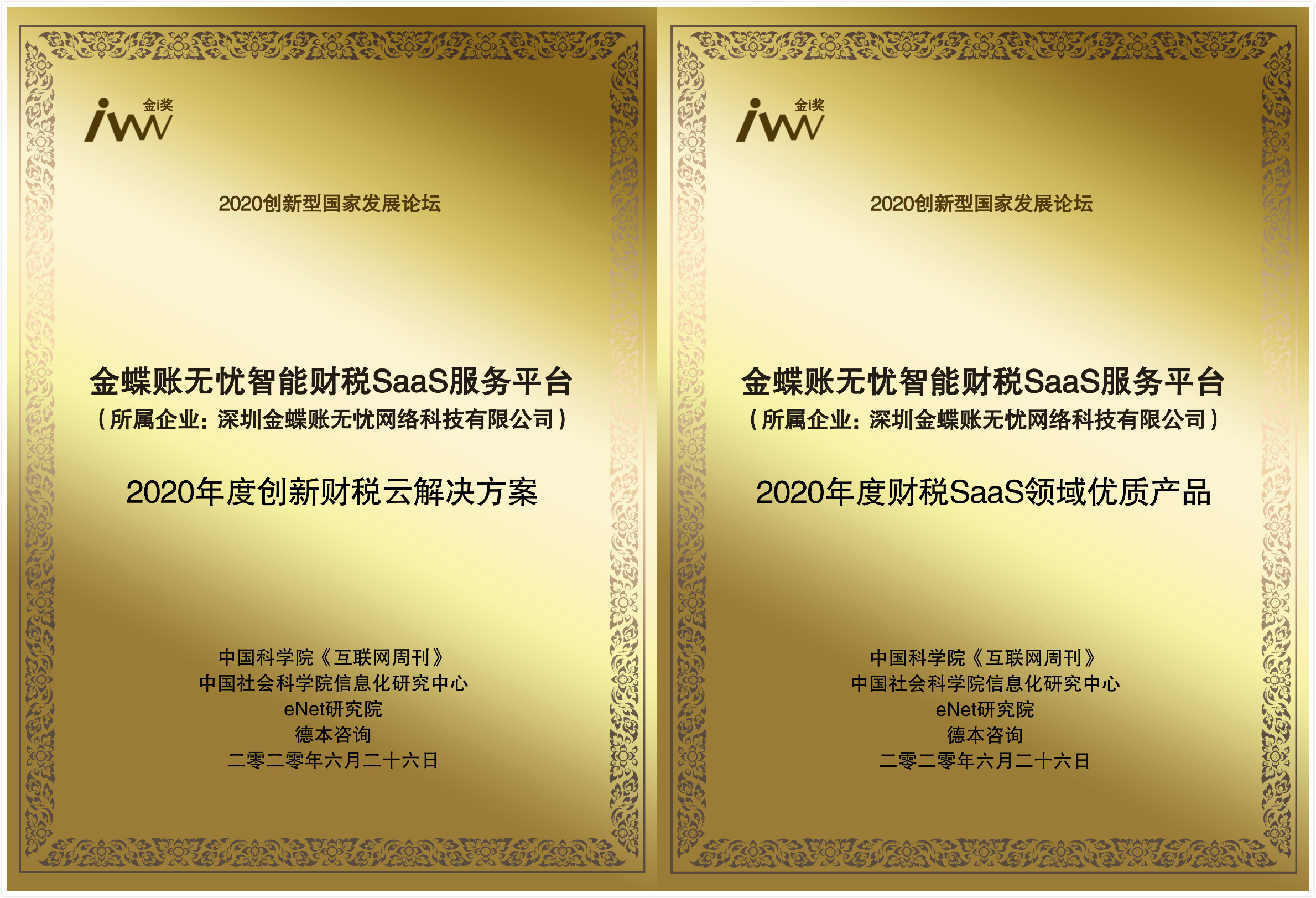 2020年6月26日,中國科學(xué)院《互聯(lián)網(wǎng)周刊》、中國社會科學(xué)院信息化研究中心、eNet研究院、德本咨詢聯(lián)合主辦的“2020創(chuàng)新型國家發(fā)展論壇”線上發(fā)布會盛大舉行。在大會上,主辦方正式揭曉了金i獎企業(yè)獲獎名單,致力以創(chuàng)新帶動代賬企業(yè)數(shù)字化轉(zhuǎn)型升級的金蝶賬無憂榮獲2020年度“財稅SaaS領(lǐng)域優(yōu)質(zhì)產(chǎn)品獎”與“創(chuàng)新財稅云解決方案”兩項大獎,本次榮譽獲評除了是對金蝶賬無憂產(chǎn)品的品質(zhì)認證,更是對其創(chuàng)新力的高度認可。